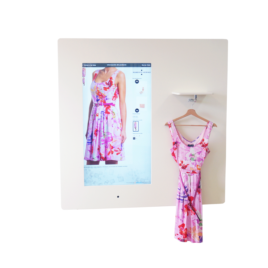 The customer picks an item they are interested in and approaches the AdvanLook. The RFID subsystem of AdvanLook detects the product, the screen of AdvanLook shows images of the product, together with information like colour and sizes available, composition price etc…The customer received recommendations of matching products and accessories, the customer can use the AdvanLook touch screen to browse through other products, request that an employee brings them a product etc…
